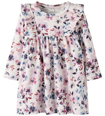 Beautiful Name It dress with floral print in shades of violet, blue and pink. The Dress has long sleeves and ruffle details at the shoulders, which gives an elegant look. It opens with a hidden push-botton at the left shoulder.