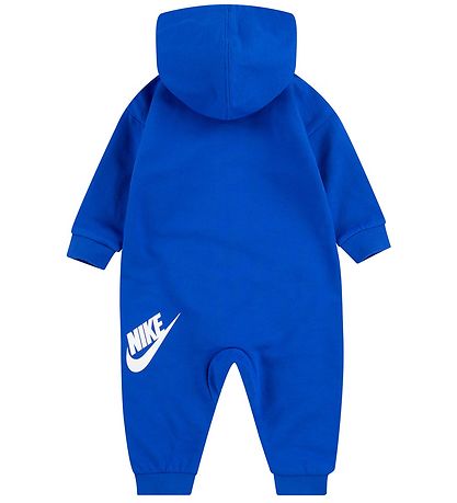 Smart Nike jumpsuit in blue sweat, and on the front there is a large, white logo print.