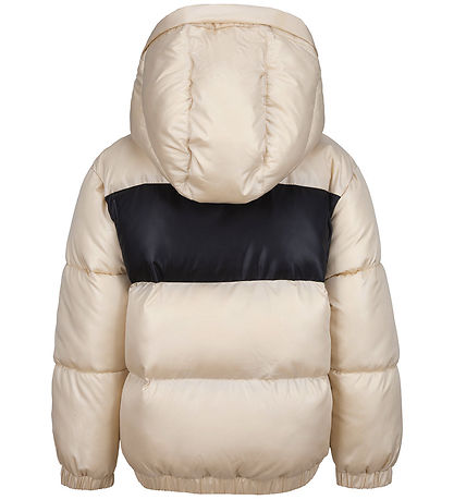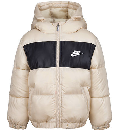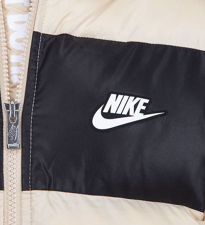 Cool Nike puffer jacket in beige with a black panel on the chest and back. The quilted jacket has a white rubber logo on the left chest and horizontal stitching.