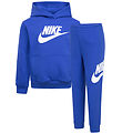 The Nike hoodie has a fixed hood and it has long sleeves and wide ribbed edges. In front there is a large kangaroo pocket. The sweatpants have long legs with wide ribbed edges, and there is a wide elastic edge at the waist. The sweat set has soft, brushed cotton on the inside.