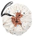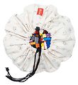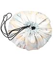 The Play&Go toy blanket is a large circular piece of fabric with a running course all the way around with a white string, so you can lace the blanket together into a bag. You can store your toys in the bag, and when the kids think the toys should be brought into the living room, the bag can be opens and the play mat unfolds. Afterwards, it is quick and easy to clean up and put in place. The Play mat has an adjustable, removable strap so it can be easily taken around.