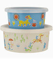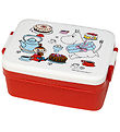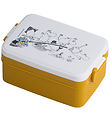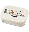 Smart Rätt Start snackboxes in a set of two, consisting of a large in beige and a little in blue, both with colorful Mumi print. The snack boxes are set of an anniversary series for the Moomin 80th birthday.