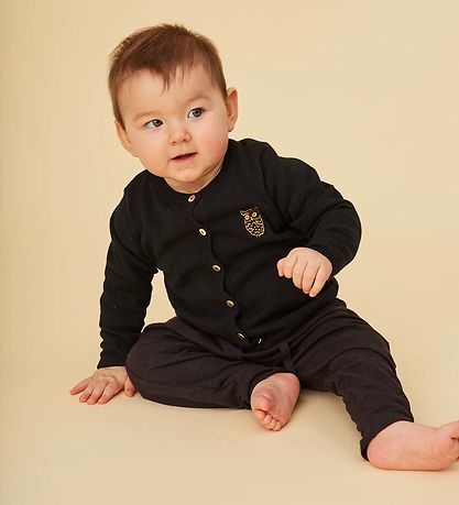 Gorgeous Soft Gallery cardigan in solid black with fine gold buttons, as well as embroidery of a gold owl on the left chest.