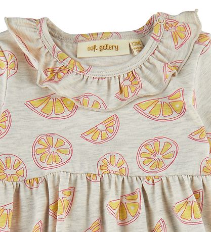 Sweet Soft Gallery dress in melange grey with an allover print of oranges in pink and yellow shades.