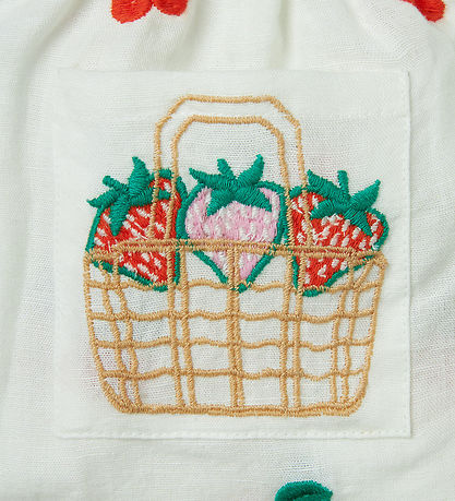 Fine Stella McCartney Kids summer set, consisting of a top and a pair of bloomers in white with embroidered, red cherries and cute Baskets. The top has narrow shoulder straps with beautiful ruffles, and they crosses at the back. The shoulder straps can be adjusted in two lengths with small buttons at the back. At the top it has a narrow elastic edge, and underneath the top falls with lots of width. At the front there are two nice pockets.