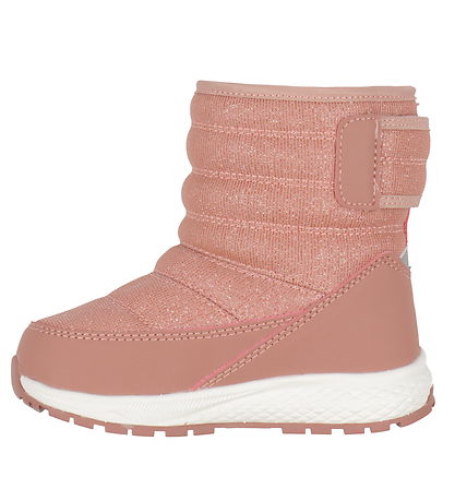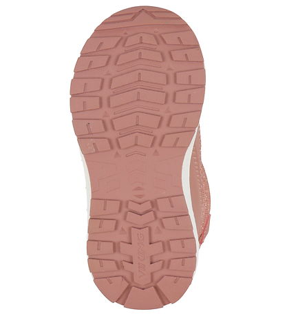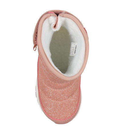 Nice Viking winter boots in dark pink glitter with horizontal stitching and with imitation leather in dark pink at the bottom. The midsole is white and under the bottom there is a dark pink sole.