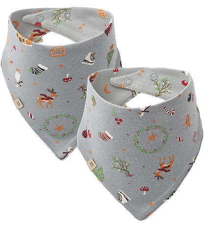 Fine Wheat drool bibs sold in a 2-Pack in dusty light blue with a print of cute Christmas motifs. They have a triangular shape and have practical push buttons with two settings at the neck. The drool bibs consist of two layers of organic cotton.