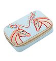 Beautiful Jeune Premier pencil case in navy, with a print on the top of a unicorn in gold glitter, with a mane in the colours of the rainbow, which extends over the entire top and small stars.