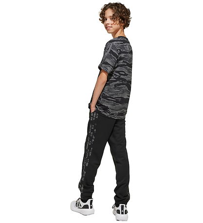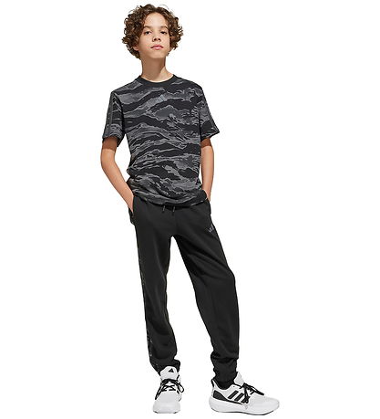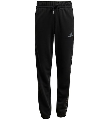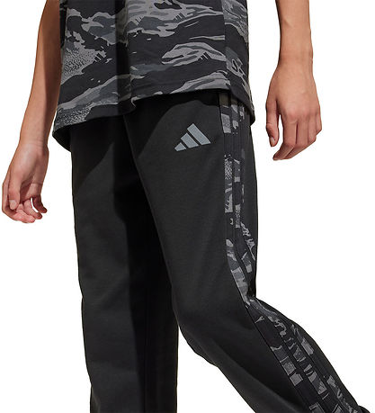 Stylish adidas Performance sweatpants in classic black with a discreet logo print on the thigh and camouflage stripes on the sides of the trouser legs.