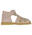 Sweet Angulus sandals in pink leather with an embroidered strawberry in red and green at the top of the foot.