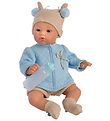 The Asi baby doll has a nice beige knitted blouse with beautiful, white lace and a checkered collar. It opens with velcro on the back. The bloomers are checkered in baby blue and white which matches the collar. On his head he has a cute hat, which has a small bow at the front. The slippers match the hat and the blouse.