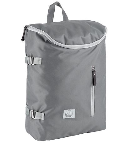 Beautiful Baby Dreamer changing bag in solid gray with light gray zippers. On the front is a nicely affixed Baby Dreamer logo.