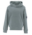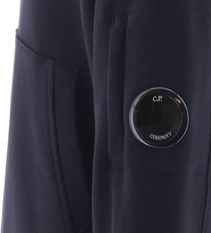 The CP Company hoodie has a Fast hood with a cotton lining, and it has long sleeves and soft ribbed edges. At the top of the left sleeve there is a pocket, which closes with a black push-botton. The hoodie has a large kangaroo pocket on the front.