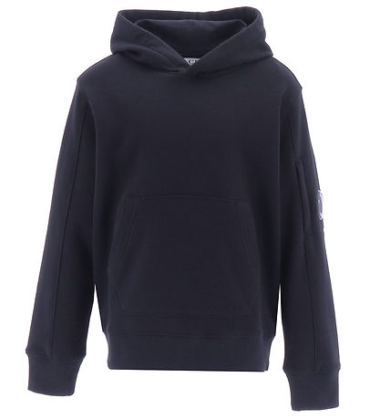 Nice CP Company hoodie in plain navy sweat. At the top of the left sleeve there is a black plastic logo.