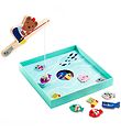 The Djeco fishing game consists of 12 wooden fish with a small magnet, which must be fished out of the box with a fishing pole with a magnet on the fishing hook.
