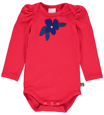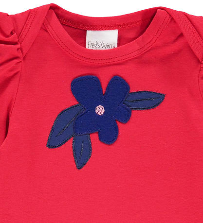 Sweet Freds World bodysuit in red, and in front there is an appliqué with navy flowers with two different structures.