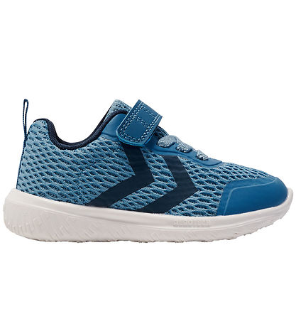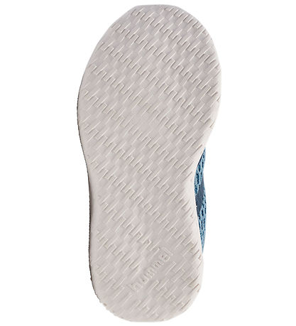 The Hummel shoes have elastic laces over the instep and are closed at the top with a Velcro strap. There is a practical strap at the back, which makes it easy to put the shoes on. Inside there is blue textile and removable insoles. The shoes have lightweight Aerotech outsoles with a practical pattern under the bottom, which ensures good footing.