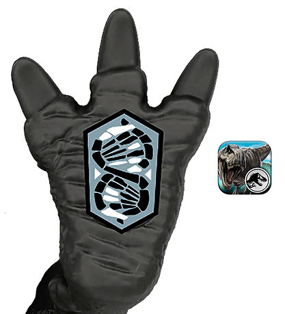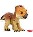 Fantastic Jurassic World dinosaur, depicting a Monolophosaurus in dark brown with gold details. The dinosaur has movable led and impressive details that make it lifelike with sharp claws and teeth.
