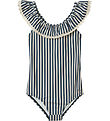 Fine Konges Sløjd swimsuit with a classic check design in blue and white. The Swimsuit has a sweet floral motif on the front and an elegant ruffle edge that adds a playful touch.