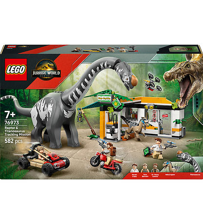 Exciting LEGO® Jurassic World set with a total of 582 blocks, which can be assembled into a detailed model of a tracking mission with a raptor and a titanosaurus.