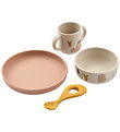 The Liewood dinner set is made of flexible silicone that fits perfectly in the kid's hands. It will be ideal as a kid's first dinnerware, as the material means that it will not break if the kid drops it.