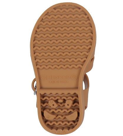 The Liewood flip flops are closed at the toes, and above the feet there is a nice braided pattern. Behind the ankles there is a narrow strap, and the flip flops are tightened around the ankle with a narrow band with a silver buckle. On the back of the buckle there is a practical push-botton, which makes it easy to take them on and off. The Flip flops have a flexible outer sole, and on the underside there are large bumps that provide a good foothold.