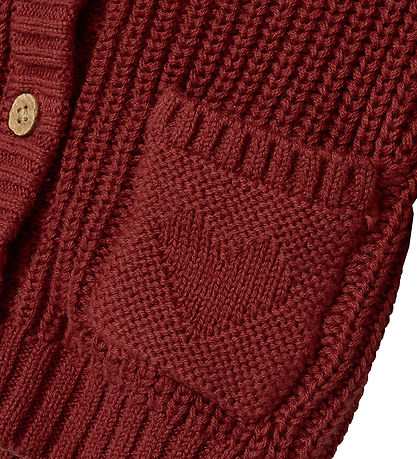 Beautiful Lil' Atelier cardigan in a deep red shade with practical pockets and fine details. The Cardigan has long sleeves and a button closure, making it a stylish addition to any wardrobe.