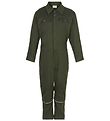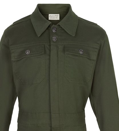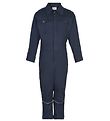The Minymo work suit is opens at the neck with two push buttons and a zipper, which has both an inside and outside wind pole. The suit has a practical elastic edge at the back at the waist, so it fits comfortably. At the front of the chest there are two pockets, which are closed with push buttons, and further down there are two open pockets. At the back there are also two open pockets and a double, open pocket on the back thigh.