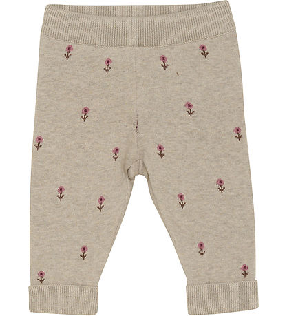 Colorful Minymo trousers in a light beige shade with small, embroidered flowers in pink. The Trousers have a comfortable elastic waist and ribbed ends that ensure a good fit and comfort for kids.