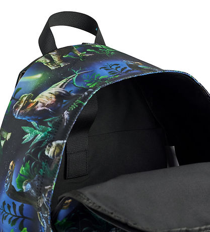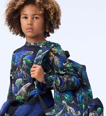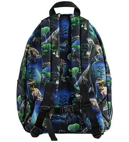 Cool Molo backpack in blue and green shades with an allover dinosaur print