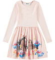 Beautiful Molo dress in black with a ribbed top and a smooth and tightly woven skirt in three layers, where the outer layer is in tulle and decorated with smiling sequin stars in pink, yellow, blue and green. The Dress has an elastic seam at the waist which together with the three layers of the skirt creates a voluminous skirt.