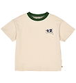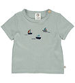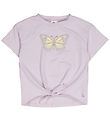 Elegant Müsli t-shirt in a pink shade with a fine floral print in white and pink. The T-shirt has an elastic throat and short puff sleeves with elastic at the bottom, which gives a nice effect.