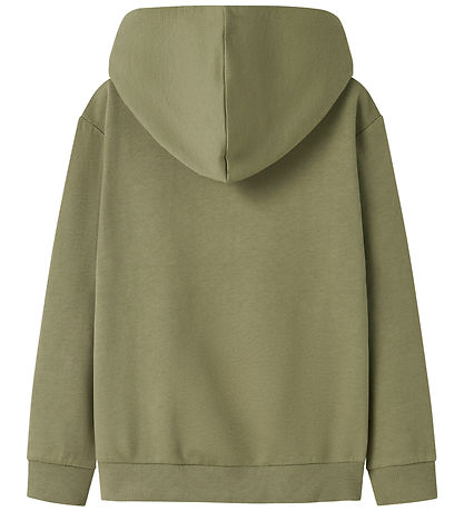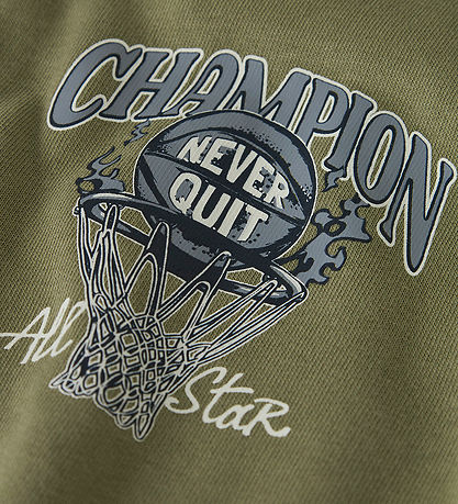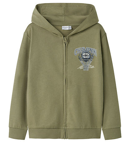 Cool Name It cardigan in olive green with a blue and white basketball print on the left chest and the text "Champion, Never Quit, All Star". The Cardigan is in a nice sweat quality with a soft hood and full-length zipper at the front. Inside is soft, brushed cotton.