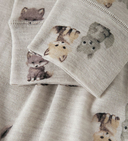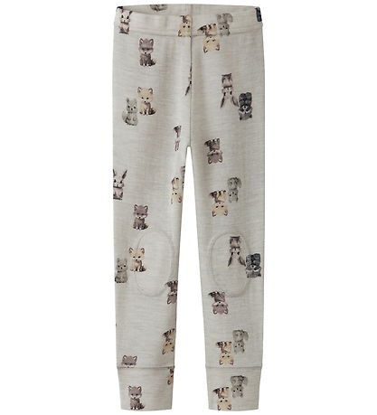 Cute Name It leggings in grey beige with a print of cute animals. The Leggings have a narrow elastic at the waist and wide edges at the leg openings. They are made of soft and breathable merino wool.