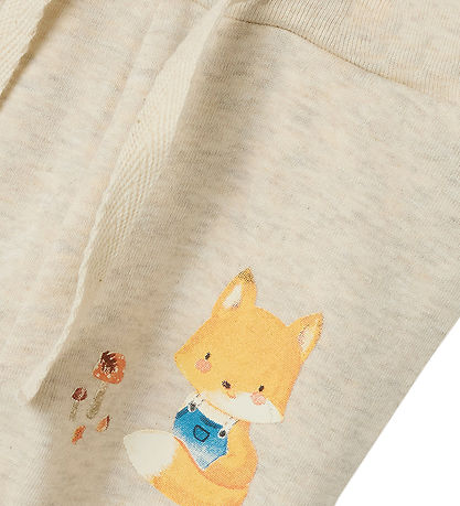 Sweet Name It trousers in melange beige, and on the front on the left side and at the bottom of the right trouser leg, an orange fox with blue trousers is printed on