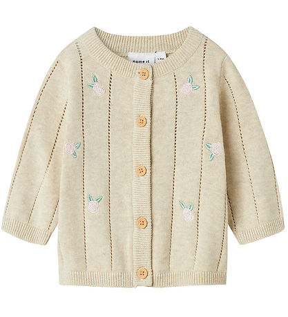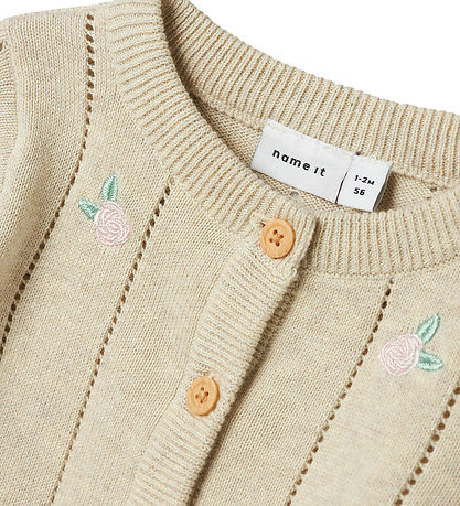Beautiful Name It cardigan in melange beige with fine embroidered roses and a classic button closure at the front in a beautiful knitted structure. This cardigan from Name It is ideal for adding a soft and cozy layer to any outfit.