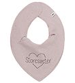 The teething bib is closed with a press stud in the neck and is made of strong two-layer cotton so that teething does not penetrate so well. This teething bib is purple.