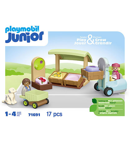 Fun Playmobil Junior set with 17 parts, which can be assembled into an organic market stall and forklift.