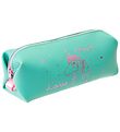Fine Rosajou makeup bag in green, with a print of a unicorn and the text "Love - Rosajou" in pink glitter on the front. At each end there is also a card, pink handle.