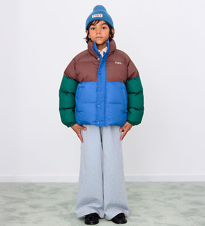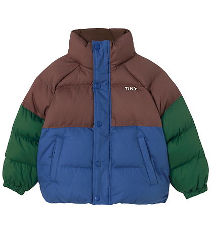 Stylish Tiny Cottons puffer jacket in a nice combination of brown, green and blue. The Jacket has a simple logo print on the front, which adds a discreet detail.
