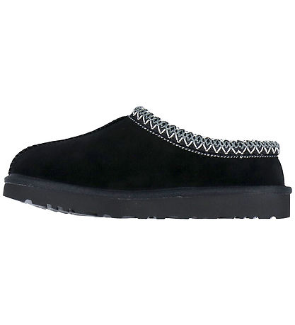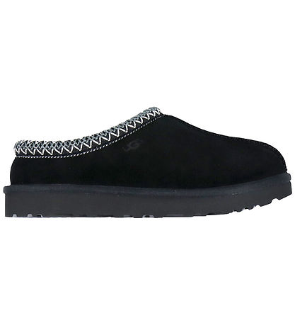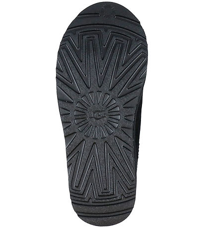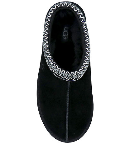 Stylish UGG shoes in black suede, with the brand's name embossed into the leather on the outside. The opening has decorative stitching in white and grey.