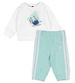 The adidas Performance sweatshirt has long sleeves and a round neckline. All openings of the sweatshirt have ribbed edges, which provide a good fit. The sweatpants have a wide elastic edge at the waist, which can be adjusted with a lace inside. the leg openings have narrow elastic edges, which tighten the sweatpants at the ankles.