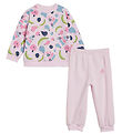 Smart adidas Performance sweat set consisting of a sweatshirt in light rose and matching sweatpants in dark pink. The Sweatshirt has a large, white logo print on the chest and the sweatpants have a white logo print on the left thigh.