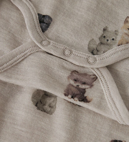 Cute Name It bodysuit in melange grey-beige with a print of cute animals in grey and brown shades. The Bodysuit has a round neckline and long sleeves. It closes with push buttons between the legs. The Bodysuit is made with soft and breathable merino wool.