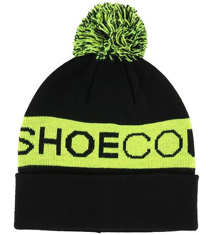 The DC knit hat has a round head shape with a tassel at the top in black and neon yellow. At the base there is a fine fold.