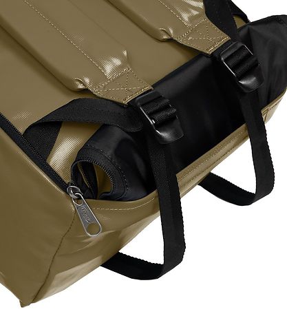 At the back there are two plastic hooks at the top so that the bag can be attached to a bicycle. To get into the shoulder straps, the back must be zipped up with a zipper, after which the outer layer of hooks can be inserted into a hole in the bottom, which is opens with a velcro strap.