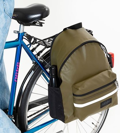 The Eastpak backpack consists of one large compartment, which is opens with a zipper with two sliders. Towards the back it has a quilted pocket with space for a laptop. On the outside of it there is another zipper pocket at the front. On the left side of the bag there is a little pocket with elastic edge edge for e.g. a water bottle.