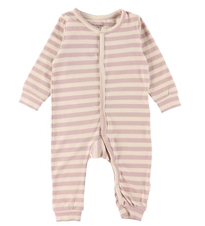 The Minymo jumpsuits have long sleeves and leg with wide edges around the wrists and ankles. The Jumpsuits have push buttons from the neck opening down to the left ankle.