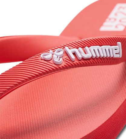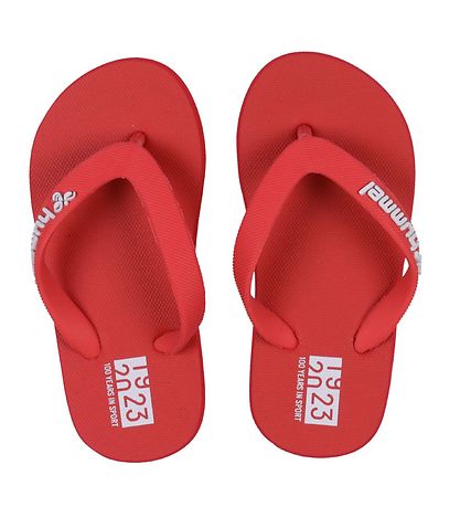 Fine Hummel flip flops in red with white logos on the straps, and on the heel there is a white print, which marks the brand's 100th anniversary.