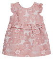 Adorable Hust and Claire dress in a fine narrow-striped design in green and white, and with a woven pattern. The carrier piece has a decorative flowers and strawberry embroidery.